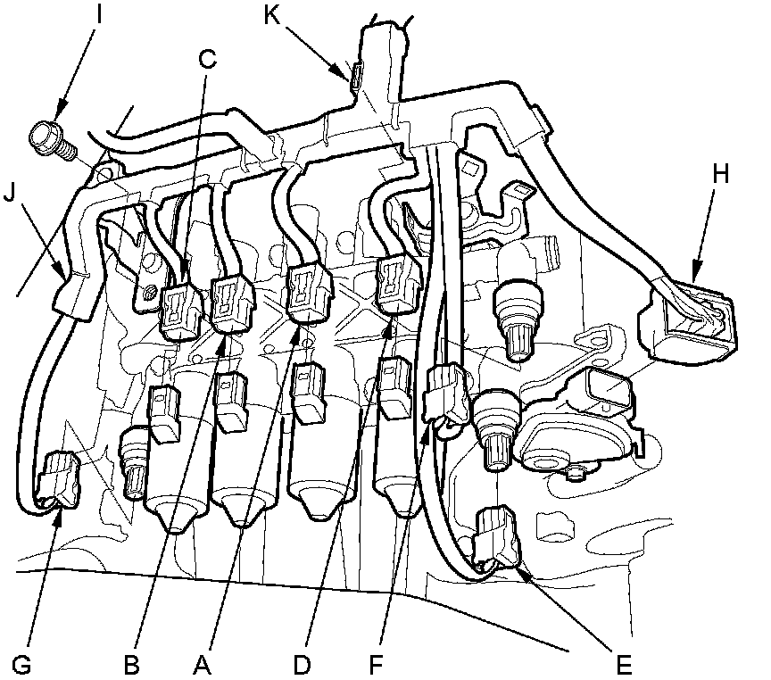 30. Remove the bolt (I) securing the harness cover (J), and remove the harness clamp (K).
