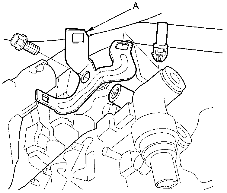 35. Remove the engine mount control solenoid valve bracket (A) from the rear cylinder head; use the bracket bolt hole to attach the engine hanger balance bar rear arm.