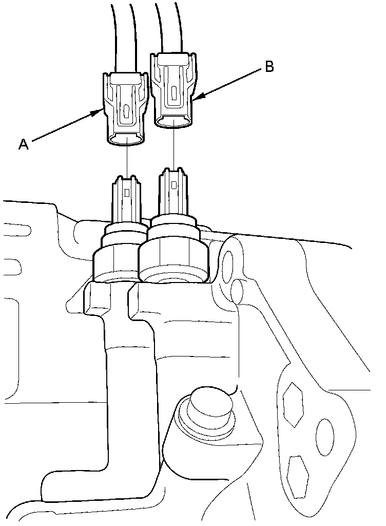 32. Disconnect the transmission fluid pressure switch A (2nd clutch) connector (A) and the transmission fluid pressure switch D (5th clutch) connector (B).