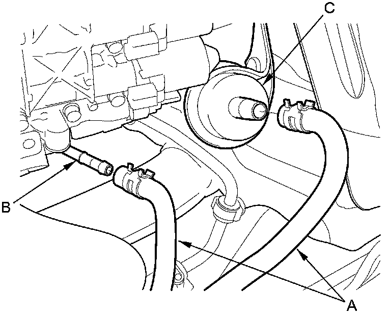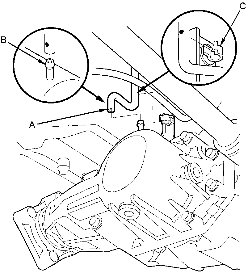 33. Remove the ATF cooler hoses (A) from the ATF cooler line (B) and the ATF filter (C). Turn the ends of the cooler hoses up to prevent ATF from flowing out, then plug the cooler hoses, the line, and the ATF filter.