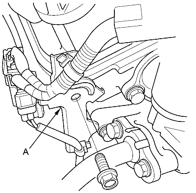 63. Remove the bolt securing the P/S fluid line clamp bracket (A) on the rear engine mount bracket, and turn the bracket away from the rear engine mount bracket.