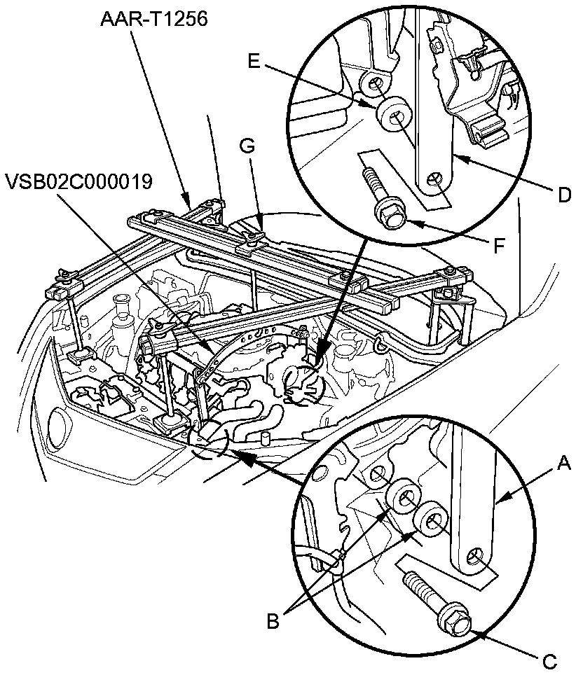 37. Install the engine support hanger (AAR-T1256) and the engine hanger balance bar (VSB02C000019) onto the vehicle as shown. Attach the front arm (A) to the front cylinder head with several spacers (B) and a 10 mm bolt (C), and attach the rear arm (D) to the rear cylinder head with a spacer (E) and an 8 mm bolt (F). Tighten the wing nut (G) by hand, and lift and support the engine/transmission.