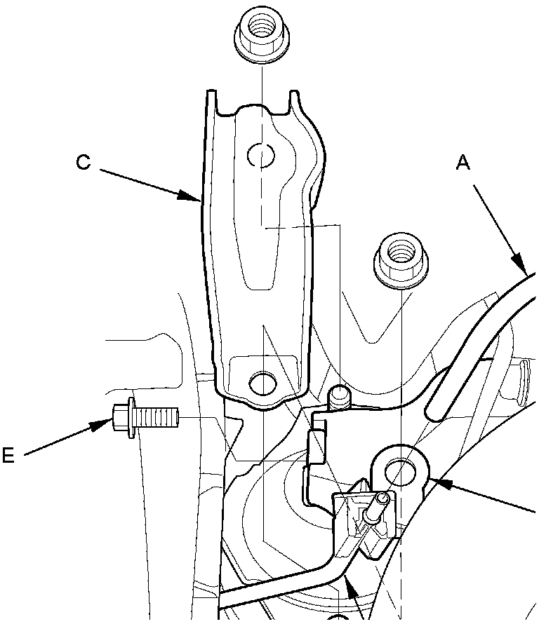 40. Remove the front mount stop (C) and the clamp bracket (D), and remove the front engine mount bolt (E).
