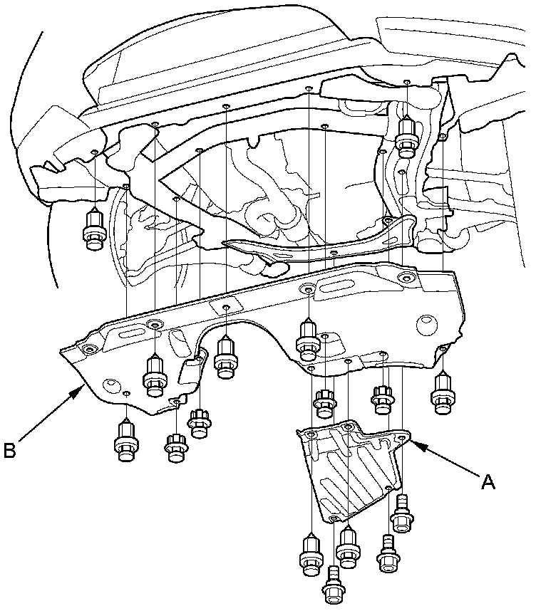 43. Remove the engine undercover (A) and the front splash shield (B).