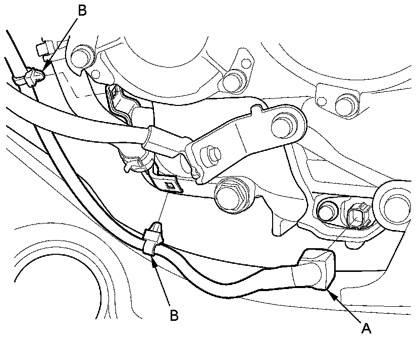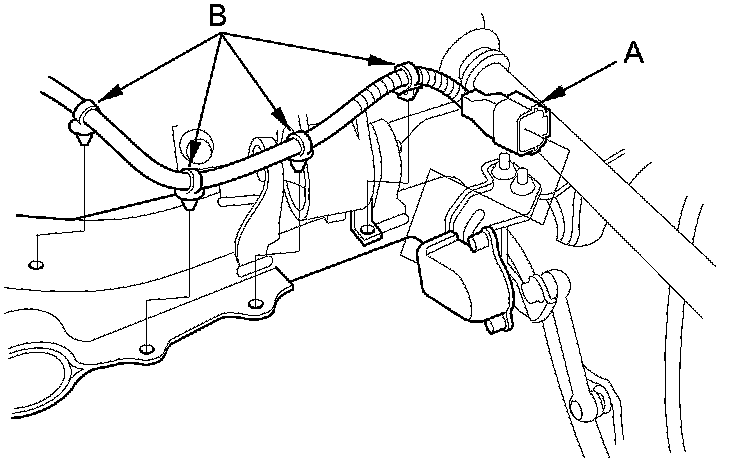 46. Disconnect the ATF temperature sensor connector (A), then remove the harness clamps (B).