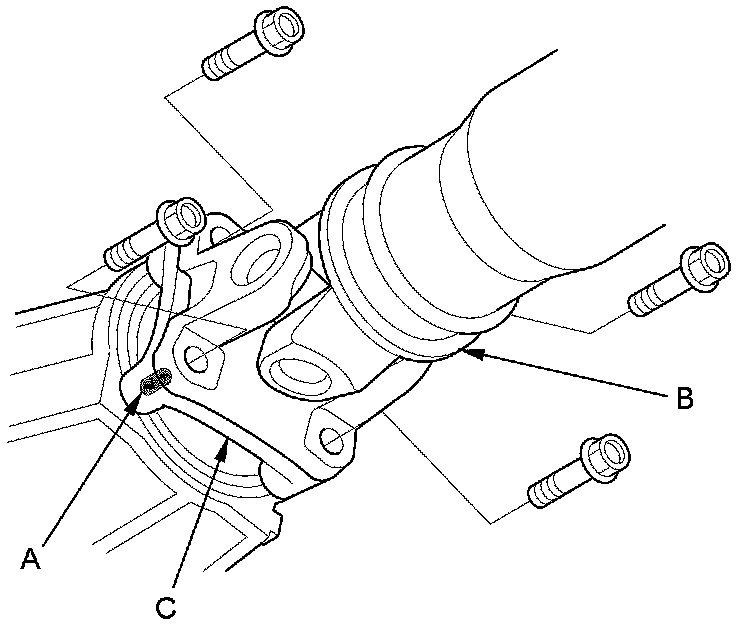 56. Make reference marks (A) across the No. 1 propeller shaft (B) and the transfer companion flange (C), and separate the propeller shaft from the transfer companion flange.