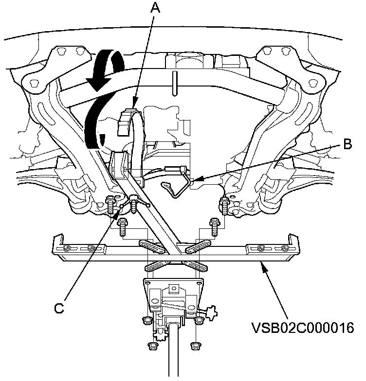 65. Attach the subframe adapter (VSB02C000016) to the front subframe by looping the strap (A) over the front of the front subframe, then secure the strap with the stop (B), then tighten the wing nut (C).
