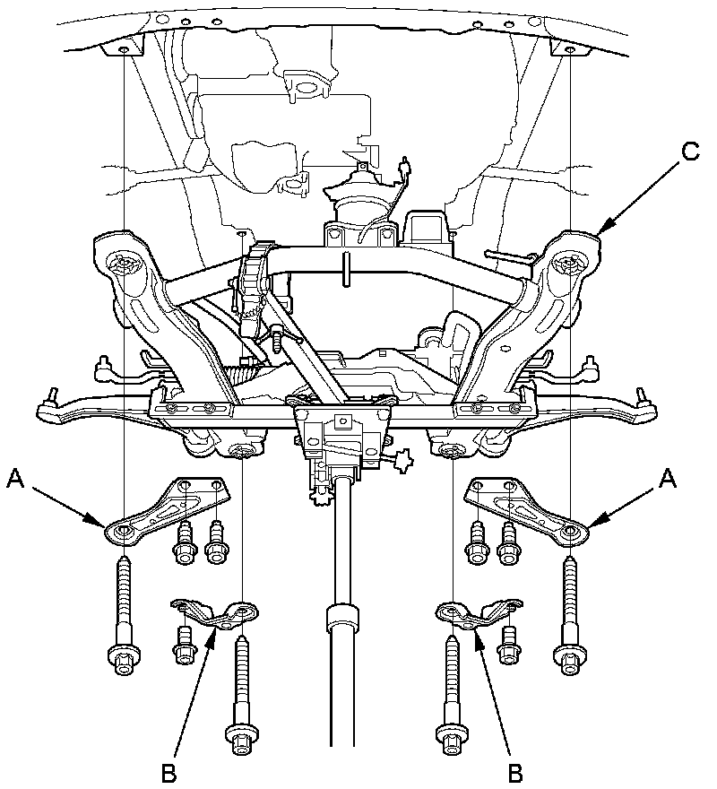 67. Remove the bolts securing the front stiffeners (A) and the rear stiffeners (B), then remove the bolts securing the front subframe (C), and lower the front subframe carefully.