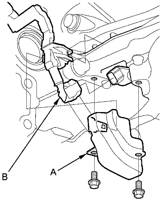 74. Remove the crankshaft position (CKP) sensor cover (A), and disconnect the CKP sensor connector (B).