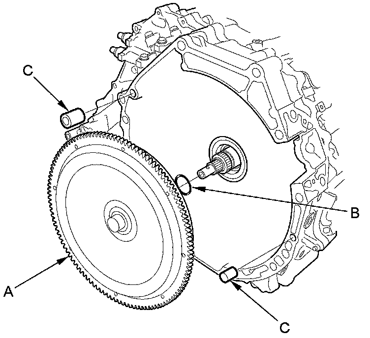78. Remove the torque converter (A), the O-ring (B), and the dowel pins (C).