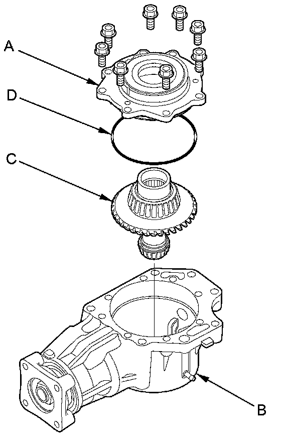 23. Install a new O-ring (C) on the transfer cover (D), then install the transfer cover on the transfer housing.