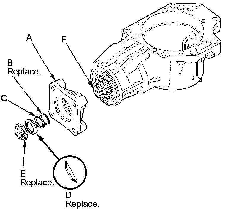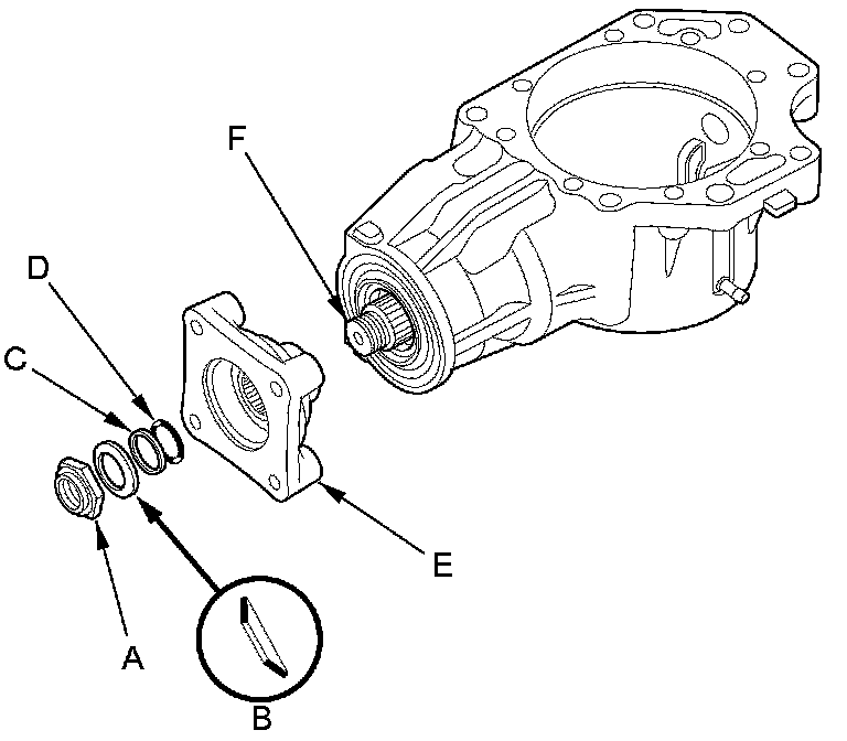 16. Install the companion flange (A). Coat a new O-ring (B) with transfer fluid (hypoid gear oil), then install the O-ring, the back-up ring (C), a new conical spring washer (D), and a new locknut (E) on the transfer output shaft (hypoid gear) (F). Install the conical spring washer in the direction shown.