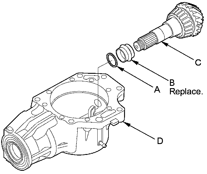 11. Remove the transfer output shaft (hypoid gear) (A) from the transfer housing (B), then remove the thrust washer (C) and the transfer spacer (D) from the transfer output shaft (hypoid gear).