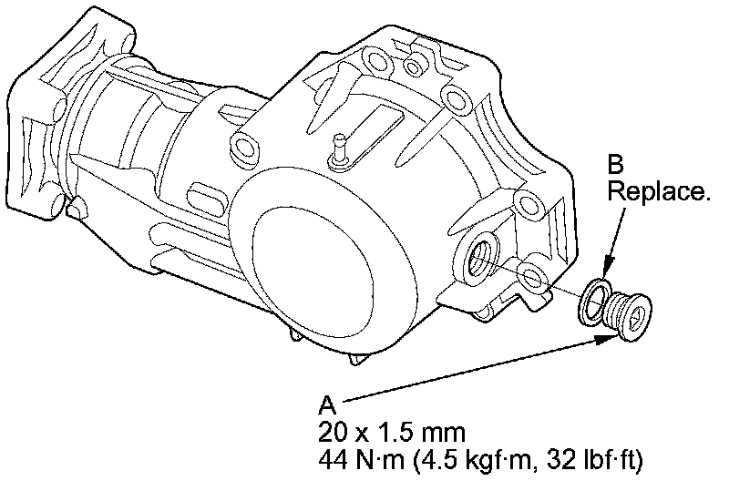24. Remove the filler plug (A), then refill the transfer assembly with transfer fluid (hypoid gear oil). Use an SAE 90 viscosity hypoid gear oil, API classified GL4 or GL5 only.