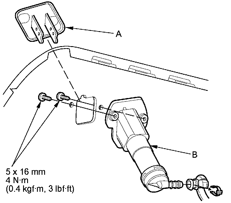 2. Remove the cover (A), tube, mounting screws and headlight washer nozzles (B).