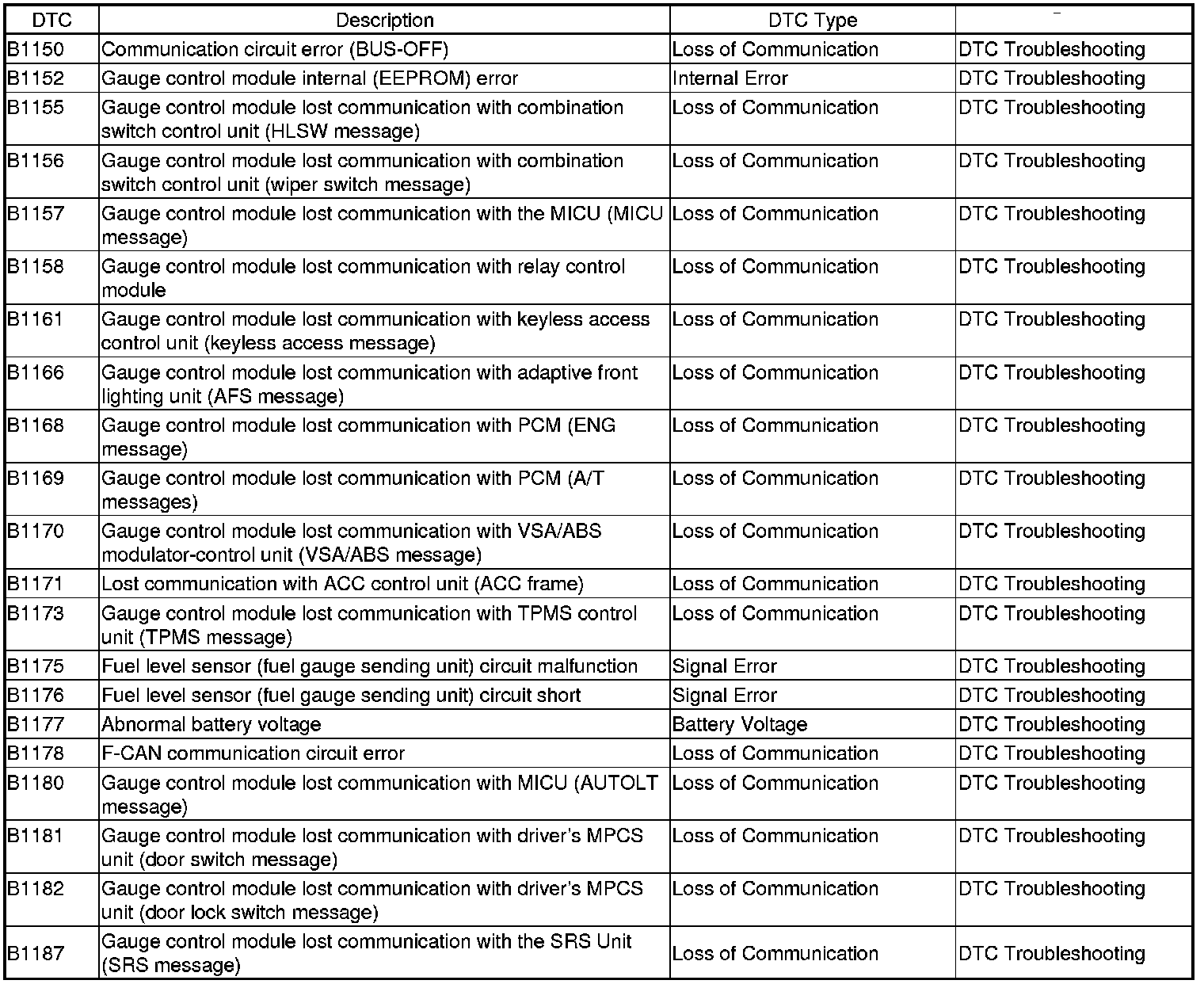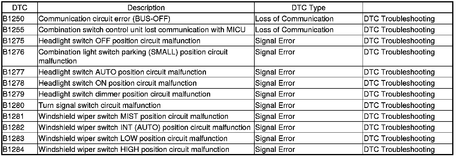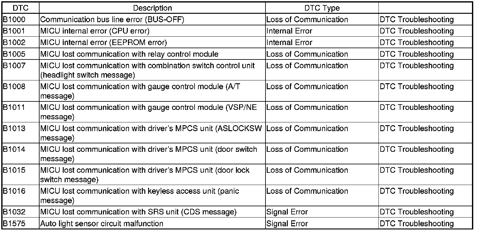 Multiplex Integrated Control System DTC Troubleshooting Index