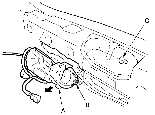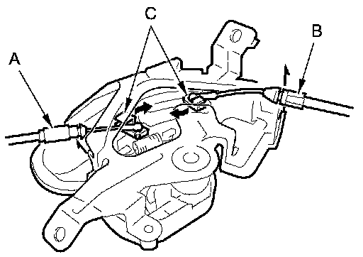 6. Pull the trunk lid latch (A) away to release the bolt (B) from the hole (C) in the body, then remove the latch.