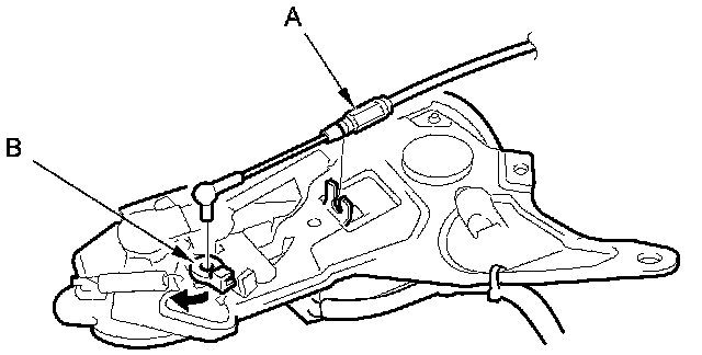4. Disconnect the actuator connector (A), then detach the connector clip (B). Remove the trunk lid opener cable (C) from the clip (D) on the body.