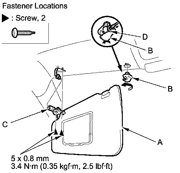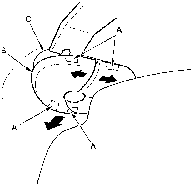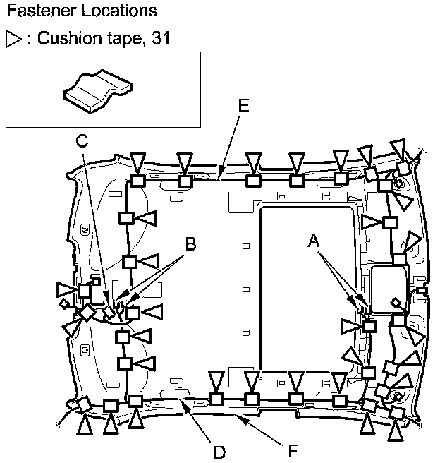 - Any fastener (B) or clip base (C) which have come off the headliner
