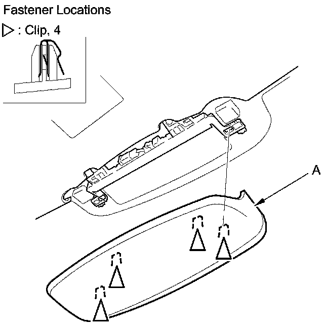 2. From both sides, release the tabs (A) with the appropriate trim tool, then turn the sunvisor cap (B), and remove it from the bracket (C).