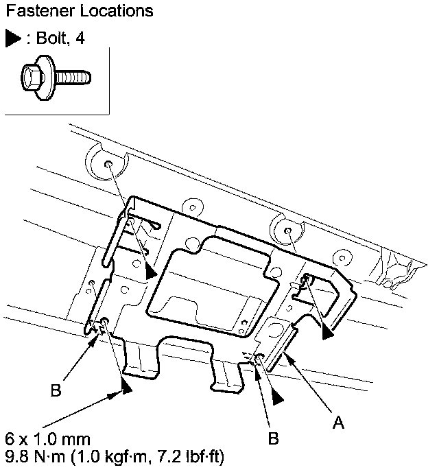 10. If necessary, remove the bolts, then remove the roof console bracket (A) by releasing two hooks (B).