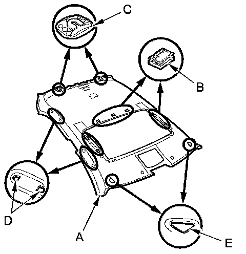 - Any damage around the grab handle holes (D) or the sunvisor holes (E) in the headliner