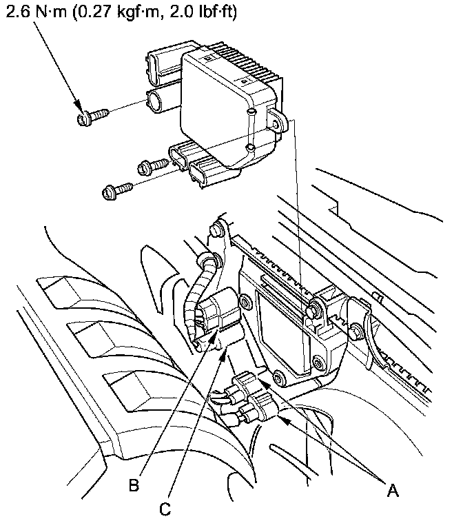 2. Disconnect the fan motor connectors (A), the 3P connector (B) and the 1P connector (C) from the RFC unit.