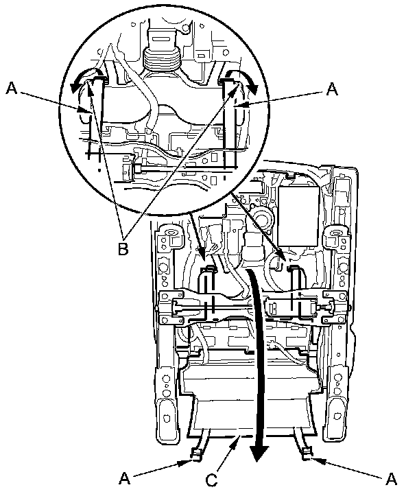 8. Release airbag attachment wire A and airbag attachment wire B from the seat-back frame (C).