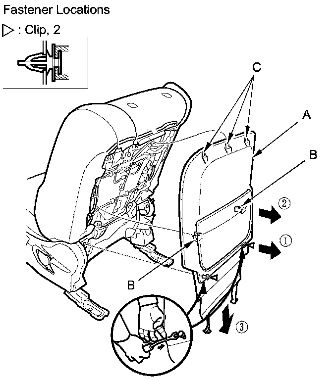 1. Turn over the seat-back cover (B) and the pad (C) as needed.