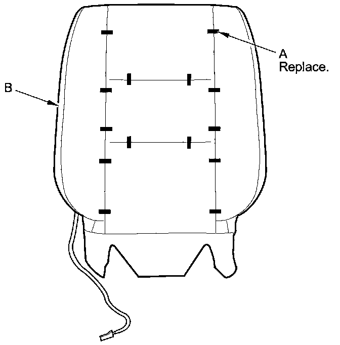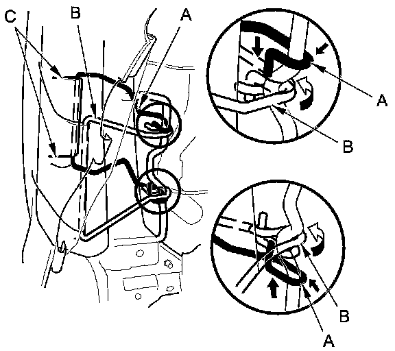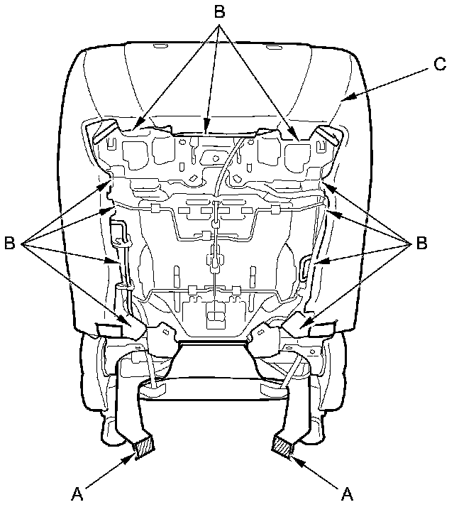 - Before installing the seat-back cover, make sure airbag attachment wires A and B are installed to the reinforcing cloths (C) correctly, and wires A and B are securely assembled.