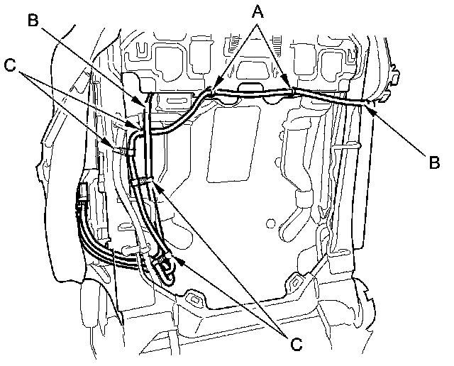11. Passenger's seat: Detach the harness clips (A) fastening the OPDS sensor harnesses (B), and release the wire harness from the harness holder (C).