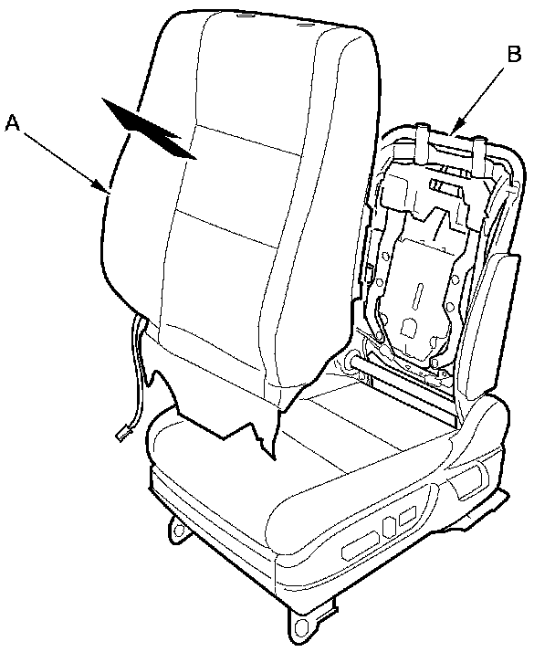 13. Remove the seat-back cover/pad (A) from the seat-back frame (B).