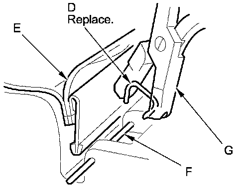 - Replace all of the upholstery rings (D) fastening the seat-back cover (E) to the pad wires (F) with new ones using commercially available upholstery ring pliers (G).