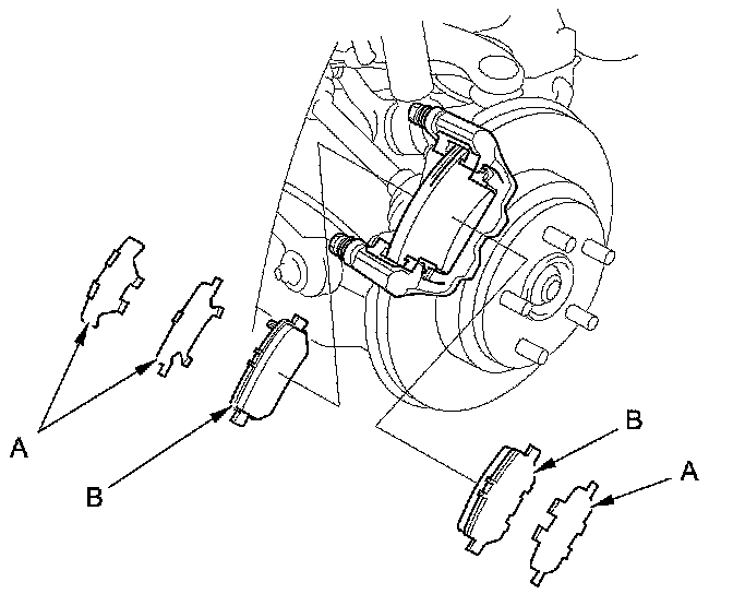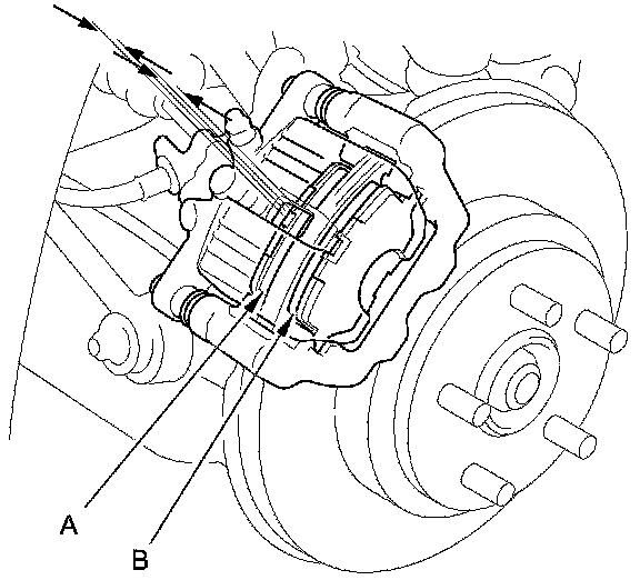 3. Check the thickness of the inner brake pad (A) and outer pad (B). Do not include the thickness of the backing plate.