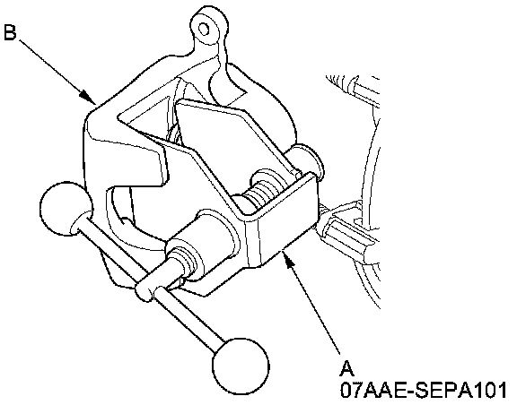 12. Install the brake caliper piston compressor tool (A) on the caliper body (B).