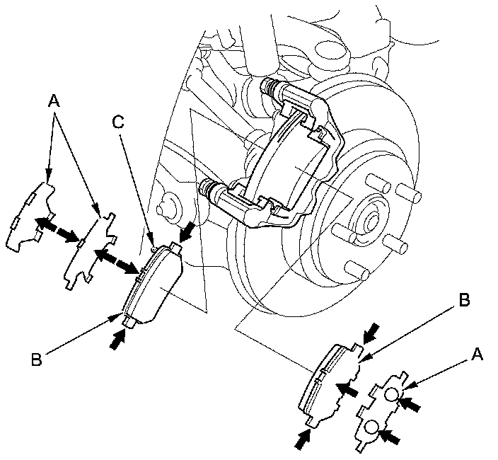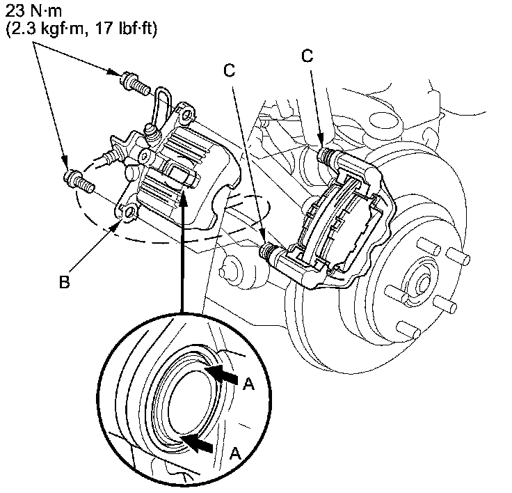 Verify that the caliper pins (C) move in and out smoothly. Clean and lube if needed.