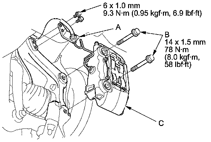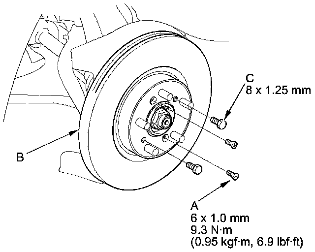 NOTE: If the brake disc is stuck to the front hub bearing unit, thread two 8 x 1.25 mm bolts (C) into the brake disc to push it away from the hub bearing unit. Turn each bolt 90 degrees to prevent the brake disc from binding.