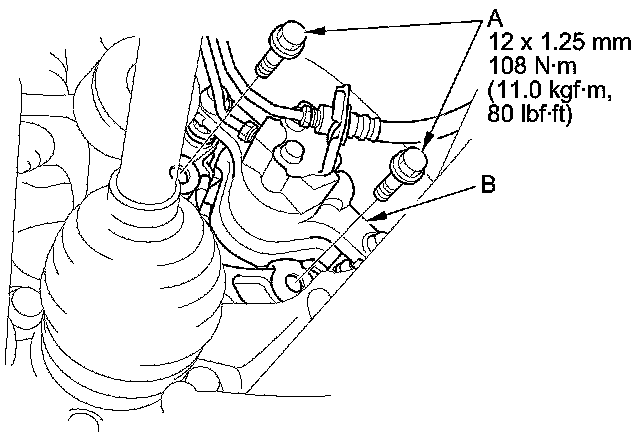 4. Remove the brake caliper bracket mounting bolts (A), and remove the caliper assembly (B) from the knuckle. To prevent damage to the caliper assembly or the brake hose, use a short piece of wire to hang the caliper assembly from the undercarriage. Do not twist the brake hose with excessively.