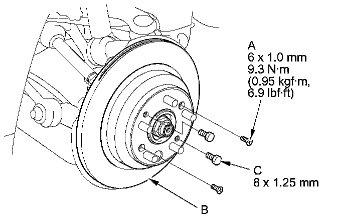 - If the brake disc/drum is stuck to the hub bearing unit, thread two 8 x 1.25 mm bolts (C) into the brake disc/drum to push it away from the hub bearing unit. Turn each bolt 90 degrees at a time to prevent the brake disc/drum from binding.