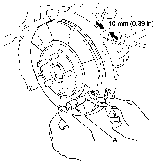4. Using a micrometer (A), measure the brake disc thickness at eight points, about 45° apart and 10 mm (0.39 in) in from the outer edge of the brake disc. Replace the brake disc if the smallest measurement is less than the maximum refinishing limit.