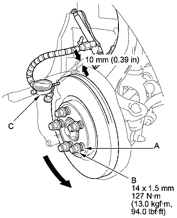 6. Set up the dial gauge (C) against the brake disc as shown, and measure the runout at 10 mm (0.39 in) from the outer edge of the brake disc.