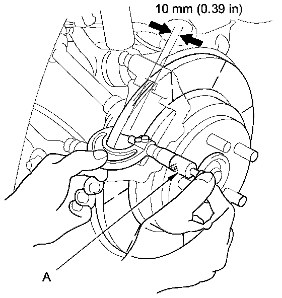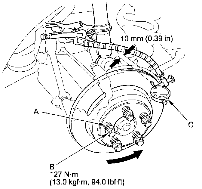 6. Set up the dial gauge (C) against the brake disc/drum as shown, and measure the runout at 10 mm (0.39 in) from the outer edge of the brake disc/drum.