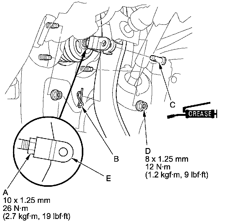 5. Loosen the clevis nut (A), then remove the lock pin (B) and the clevis pin (C).