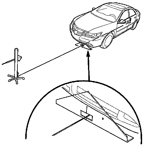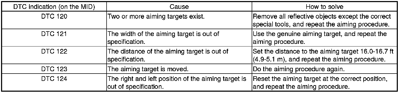 NOTE: The result of all auto aiming can be confirmed by the HDS, by the figure and words displayed on the MID, or by the brake lights illuminating. When the figure is not in the range, 100±2 or a tone is sounded by the vehicle when the aiming point is out of specification, or when the brake lights do not come on, the auto aiming is not completed correctly. If DTC 120, 121,122, 123, or 124 is indicated, the aiming target is not set correctly. Reset the aiming target.