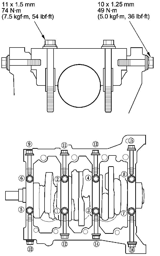 22. Tighten the main bearing cap bolts, then tighten the main bearing cap side bolts to the specified torque in the sequence as shown. Repeat the torque sequence again to ensure the bolts are properly torqued.