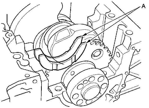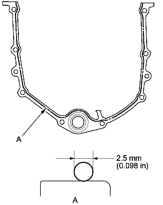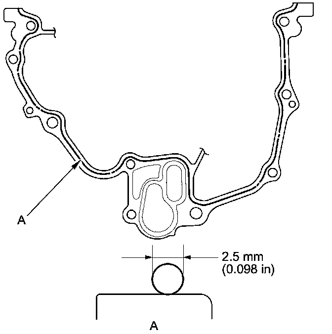 - Apply a 2.5 mm (0.098 in) diameter bead of liquid gasket along the broken line (A).