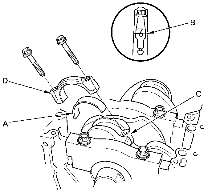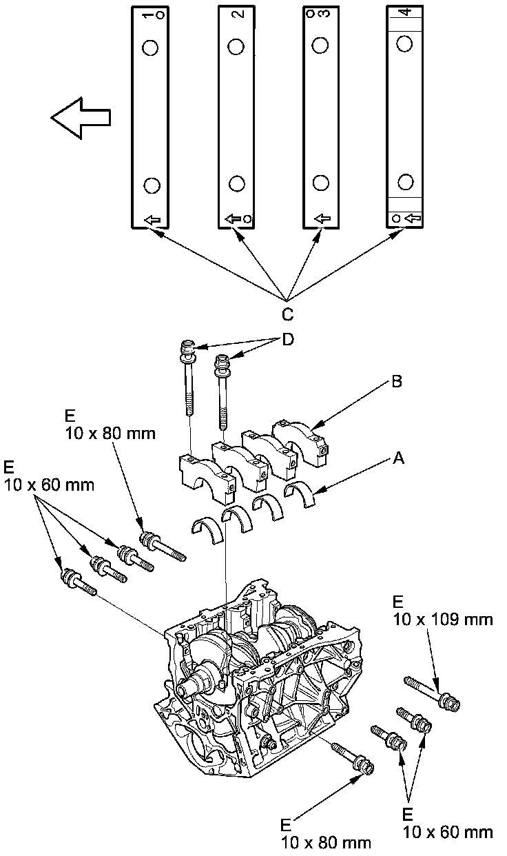 9. Apply new engine oil to the bolt threads and flanges, then loosely install the bearing cap bolts (D) and the bearing cap side bolts (E).