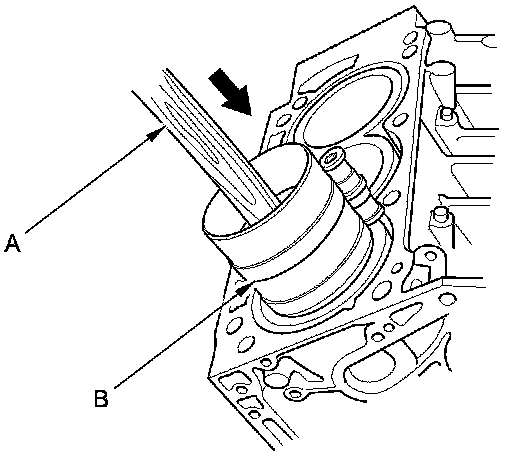 14. Position the piston/connecting rod assembly in the cylinder, and tap it in using the wooden handle of a hammer (A). Maintain downward force on the ring compressor (B) to prevent the rings from expanding before entering the cylinder bore.