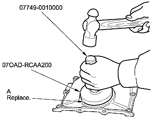26. Using the driver handle, 15 x 135L and the oil seal driver attachment, 106mm, drive in the new crankshaft oil seal (A) until the oil seal driver attachment bottoms on the engine block end cover.