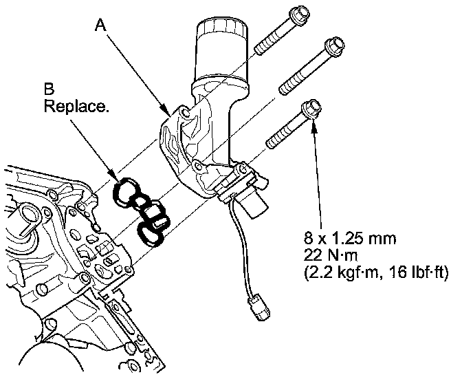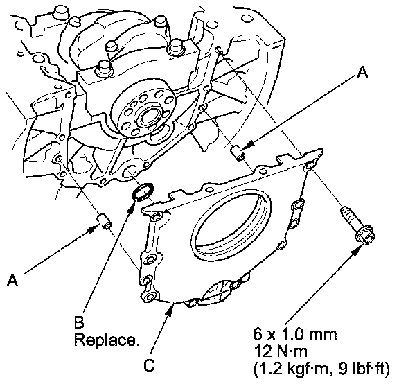 20. Apply new engine oil to the bolt threads and flanges. Torque the bolts (B) to 20 Nm (2.0 kg-m, 14 lb-ft).